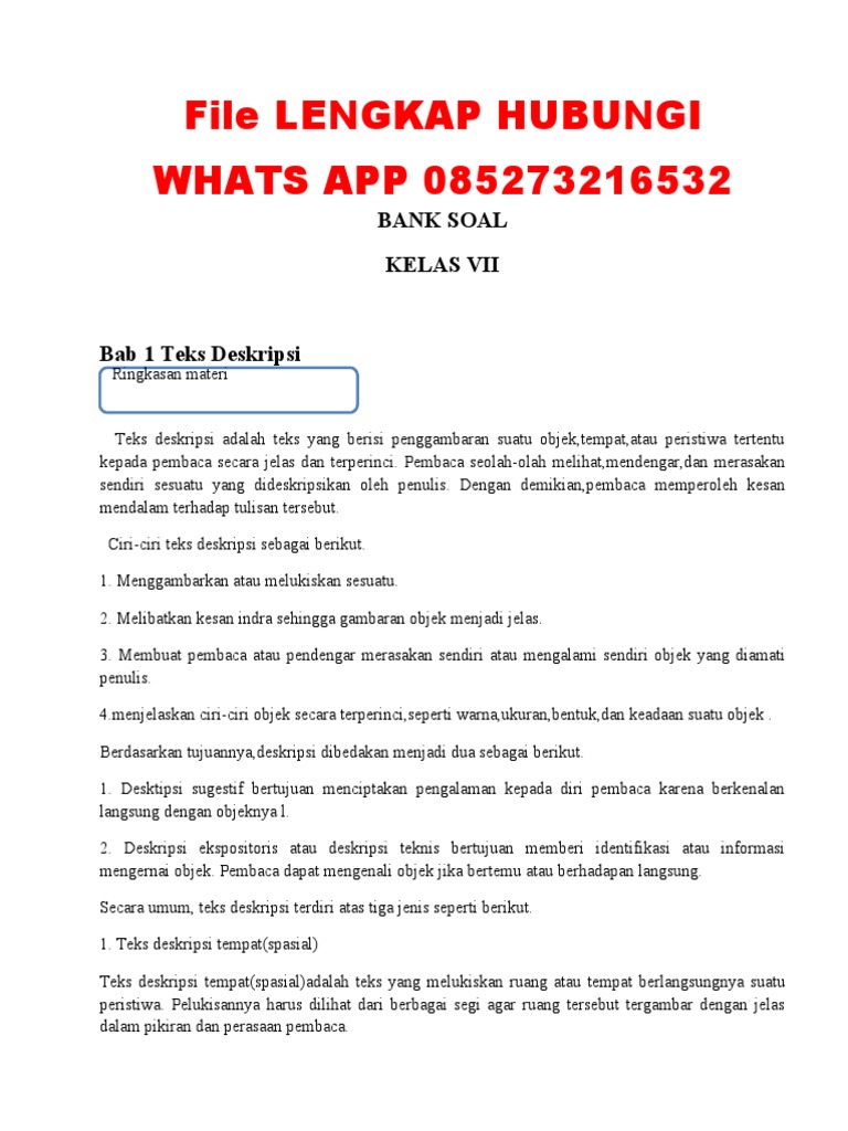 File LENGKAP HUBUNGI WHATS APP 085273216532 BANK SOAL KELAS VII Bab 1 Teks Deskripsi Ringkasan materi Teks deskripsi adalah teks yang berisi penggambaran suatu objektempatatau peristiwa tertentu kepada pembaca secara jelas dan terperinci. Latihan soal pts uts kelas 7 smp mts semester 1 kurikulum 2013 tahun pelajaran 20202021. Download contoh latihan soal IPA Matematika Bahasa Indonesia Bahasa Inggris Biologi Sekolah Online Ruangguru kelas 7-9 SMP periode 30 Maret - 3 April.