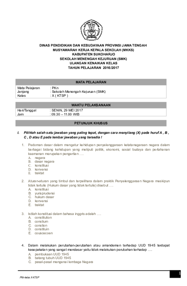 Pelaksanaan UKK bertujuan untuk mengukur pencapaian kompetensi siswa pada level tertentu sesuai Kompetensi Keahlian yang ditempuh selama masa pembelajaran di SMK. Berikut ini adalah Soal Uji Kompetensi Kepala Sekolah UKKS Online dan Offline dalam format Word ektensi Docs yang bisa di Download Gratis untuk Pemetaan Kepala Sekolah dari Badan Pengembangan Sumber Daya Manusia Pendidikan dan Kebudayaan dan Penjaminan Mutu Pendidikan BPSDMPK-PMP untuk melihat kemampuan Kepala Sekolah dalam hal Manajemen Sekolah. DINAS PENDIDIKAN DAN KEBUDAYAAN PROVINSI JAWA TENGAH MUSYAWARAH KERJA KEPALA SEKOLAH MKKS KABUPATEN SUKOHARJO SEKOLAH MENENGAH KEJURUAN SMK ULANGAN KENAIKAN KELAS TAHUN PELAJARAN 20162017 MATA PELAJARAN Mata Pelajaran.
